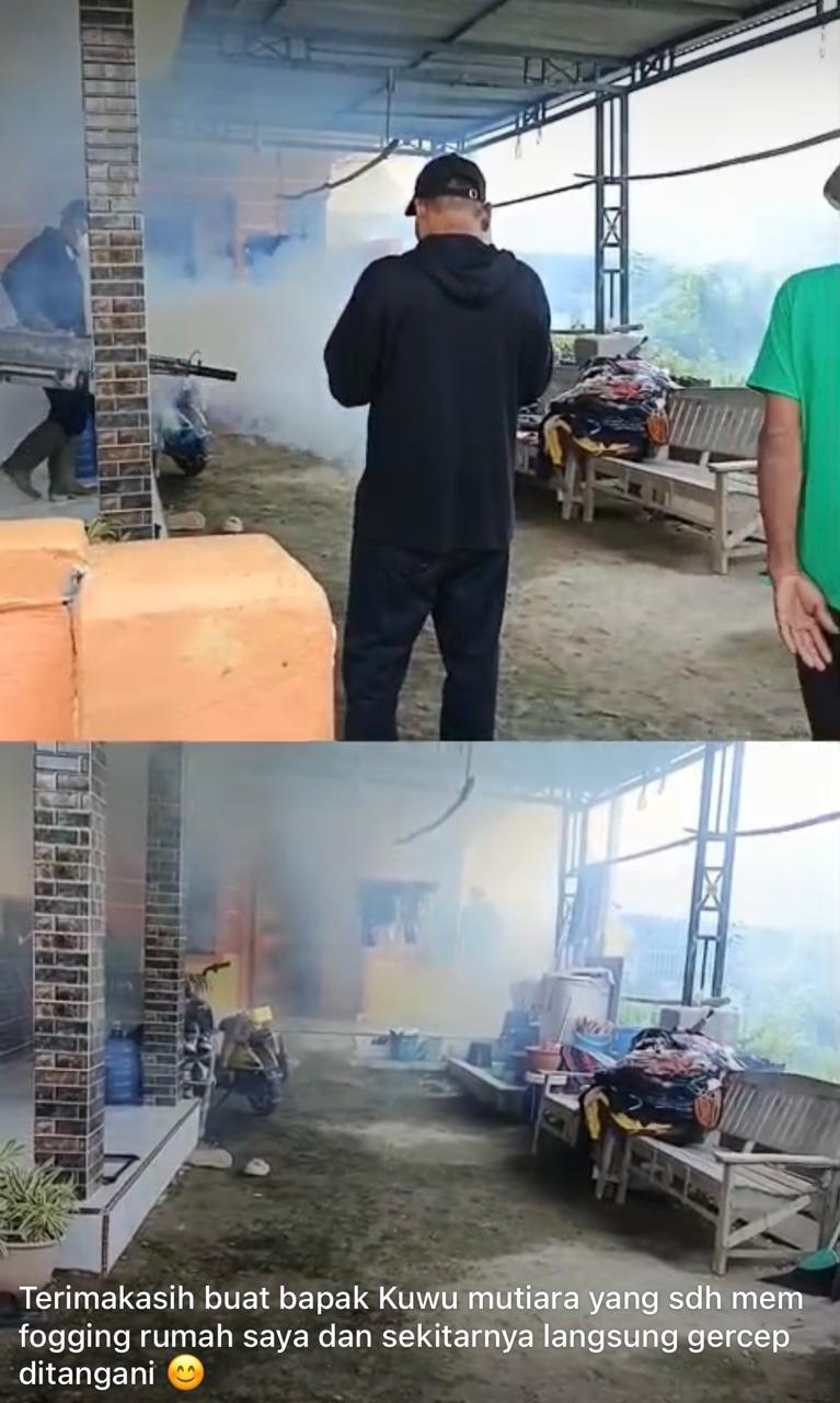 Kepala desa (Kuwu) Luwunggesik, Bapak Mutiara, terlihat turun langsung mendampingi petugas di lapangan. Dengan sigap, beliau memastikan setiap titik rawan tidak terlewatkan oleh kepulan asap petugas fogging.